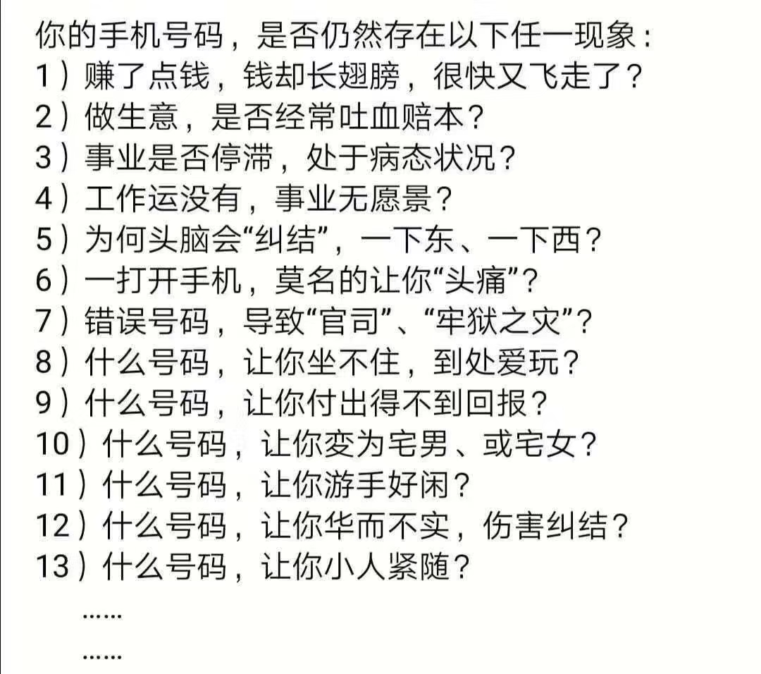 开始接触易经文字之初,以为名字对就可以了,因为好奇,也想知道更多一些改名字的分享,就很勤快的看师兄的朋友圈,发现还有一个奇门手机号码的绝招,再次了解之后才理清,原来,我们的【命】是先天已定,改不了,而【运】我们的名字,是后天的运势,是基础,是格局,对错非常关键;手机号码就是武器,对人影响非常大,有不好的磁场,肯定会发生,对的名字加上频率正确的手机号码,那么,做起事情来才会顺风顺水,得心应手。