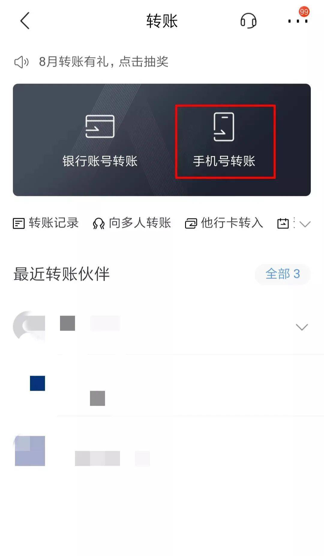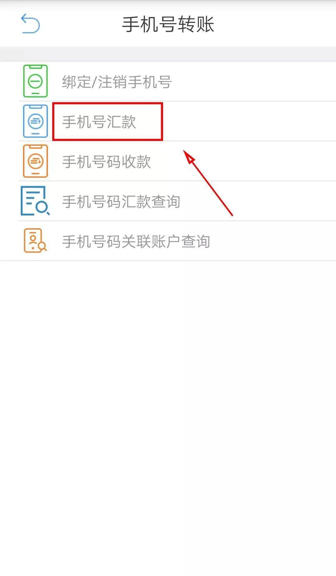 ①进入手机银行,点击“手机号转账”,选择“手机号汇款”;