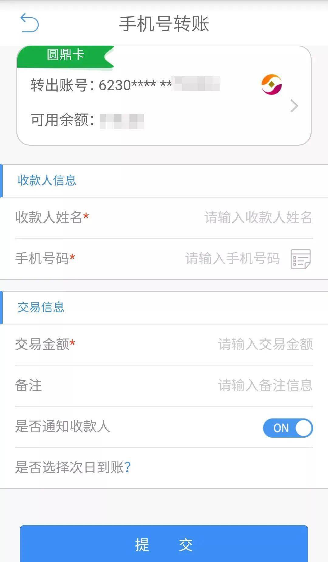 ②填写收款人姓名、收款人手机号码、交易金额等信息后提交;输入交易密码和短信验证码后即可完成转账。