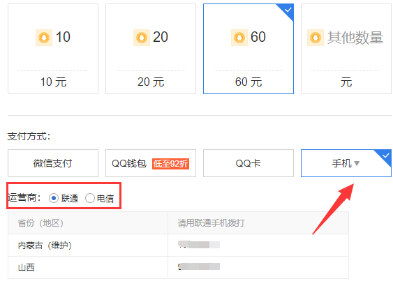 然后,将充值Q币的方式选择为“手机”。同时,选择运营商查看支持充值Q币的地区,如果可以购买按照提供的号码充值即可。