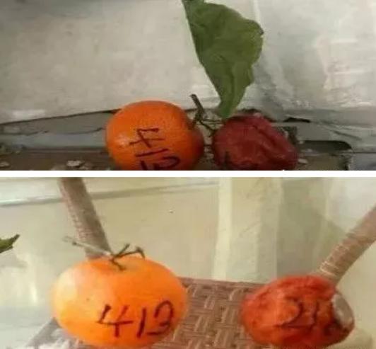 那么实验结果如何呢?过了两个月后,写有“218”的桔子已经腐烂了,而写“413”的桔子还很完整!