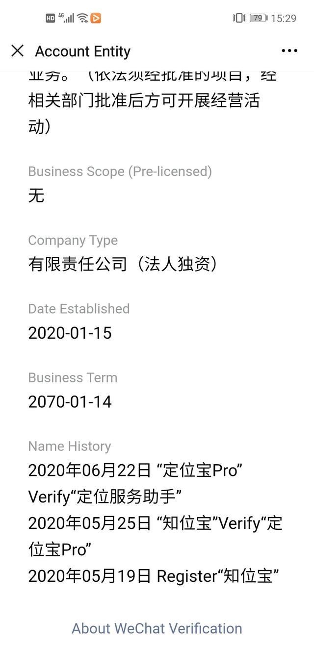 除此之外,公开资料显示,定位宝App官方微信公众号“定位服务助手”在今年5月19日至6月22日不足一个月的时间内两次变更名称。其中,5月19日注册完成后不足一周该微信公众号就将名称从“知位宝”更改为“定位宝Pro”。