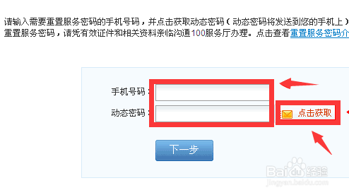 点击忘记密码后,进入到重置服务密码的页面,这里先输入手机号以及我们手机接收到的验证码。