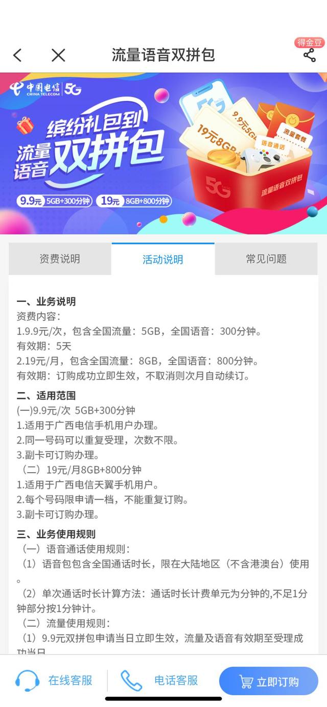4月22日,有通信人家园的网友表示,中国电信推出流量语音双拼包,有9.9元/次以及19元/月两个档位,双拼包仅适用于广西电信以及广西电信天翼的小伙伴。