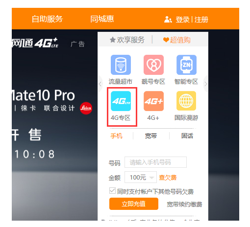 1、首先,在百度搜索手机号码电信网上营业厅点击进去,然后点击页面右侧超值购下的4G专区。