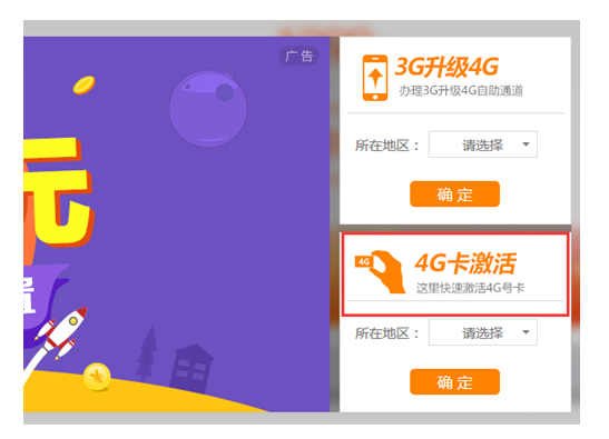 2、进入4G专区页面后,在页面右侧有一个4G卡激活的图标,选择好自己手机号所在的地区后点击确定。